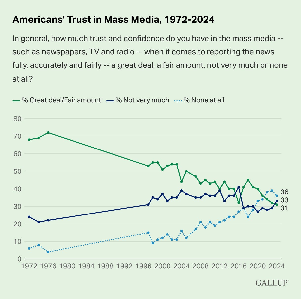 Once upon a time, Walter Cronkite closed his nightly broadcast with “And that’s the way it is.” And most Americans believed him. In 1976, a Gallup poll found that 72% of Americans trusted the media to report “fully, accurately, and fairly.” In 2024, Gallup found that number is now at just 31%. Trust didn’t vanish overnight. As visualized in the chart below, Gallup conducted that poll year after year, revealing that trust in news media was slowly declining over time. But as it was unraveling piece by piece, something else was gradually increasing to keep viewers engaged: soundbite culture.